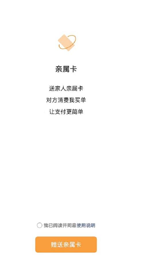 操作流程方面,《使用说明》表示,“代付方可选择为父亲、母亲、子女等亲人开通(赠送)亲属卡使用方接受亲属卡后,亲属卡会被添加为使用方的扣款渠道,并且将在下次消费时优先使用该方式支付。”